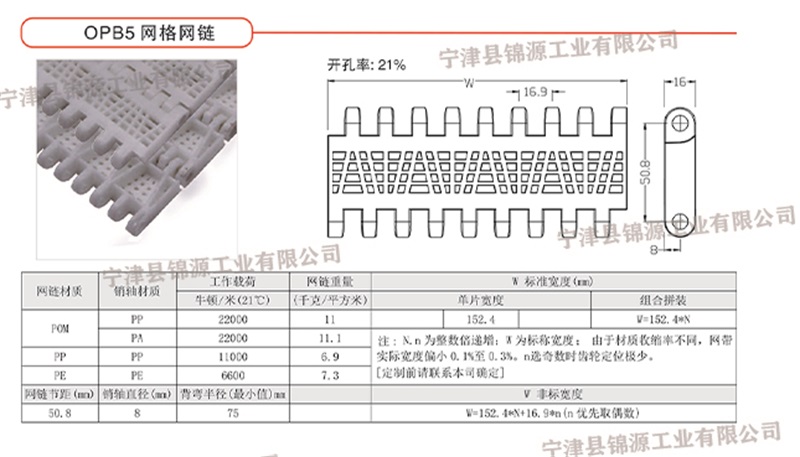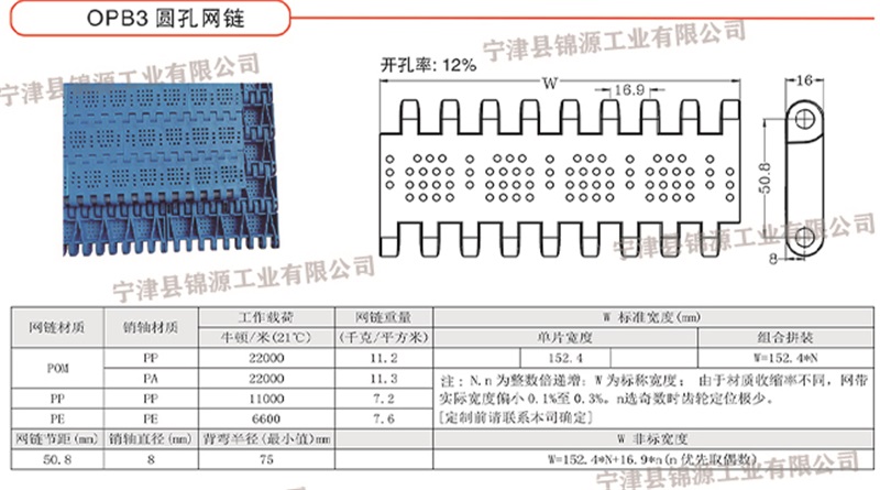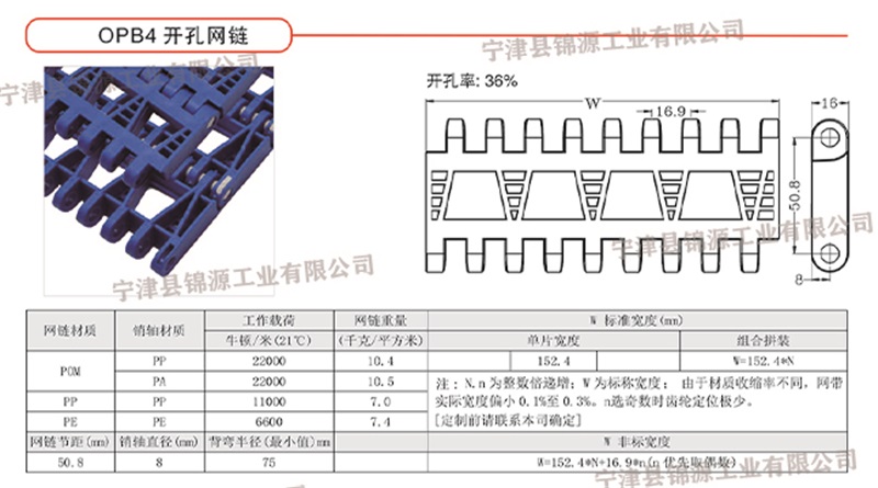 塑料網(wǎng)帶由鏈輪驅(qū)動,網(wǎng)帶節(jié)距主要有12.7mm、15.2mm、19.05mm、25.4mm、27.2mm、38.1mm、50.8mm、57.15mm,開孔率2%-48%